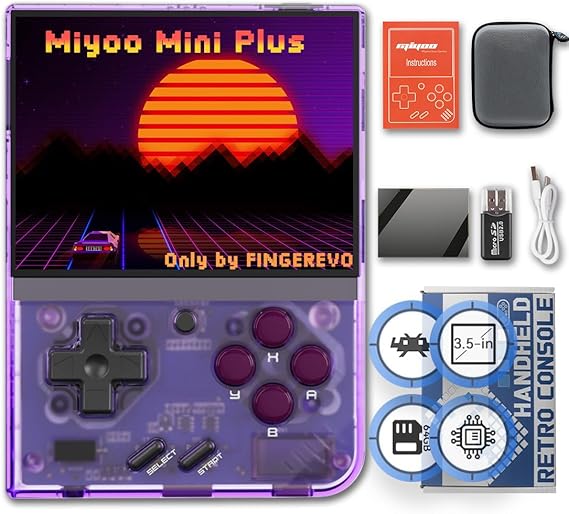 - Package contents: 1*Miyoo Mini Plus T-Purple-64, 1*Customized Portable Case Exclusive by FINGEREVO, 1*Screen Protector, 1*USB-C Cable, 1*TF-card Reader, 1*Instruction.